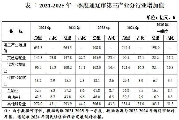 2021-2025年一季度,通辽市第三产业行业分布呈现出“传统行业托底、新兴行业赋能”的阶段性特征。交通运输业和批发零售业持续发挥稳定作用,增加值占比分别稳定在20.0%左右和15.0%左右;消费市场受疫情影响较大,但韧性十足,住宿和餐饮业增加值占比由2.3%稳步回升至3.4%;金融业占比波动回落、房地产业增长有所乏力,暴露出传统服务业的增长瓶颈;2025年一季度其他服务业增加值占比达到51.8%,成为增长最快领域,反映出全市产业结构正从传统商贸驱动向多元化业态过渡(详见表二)。