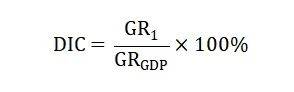 以产业贡献度来表示各产业对全市总体经济发展的贡献度量指标。用字母DIC表示产业贡献度,产业当期增量用GR1表示,GDP当期增量用GRGDP表示。下式给出产业贡献度计算方法:
