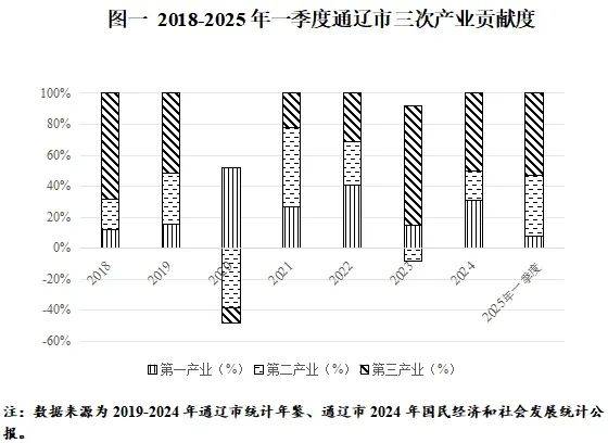 按照上述公式计算2018-2025年一季度通辽市三次产业贡献度,如图一所示。对比图中三次产业贡献度可以发现,第三产业长期占据主导地位,2018-2019、2023-2025年一季度第三产业贡献度均超过50.0%,但2020年受疫情冲击影响出现极端负值,与同期第二产业贡献度负值形成联动异常,反映出疫情对上下产业链影响较严重,第三产业贡献度较大程度上支撑着地区经济体量的增长,2025年一季度,第三产业贡献度达到52.8%,配合第二产业(贡献度为39.2%)逐步复苏,初步形成双轮驱动格局,但产业抗风险能力仍需进一步提升。
