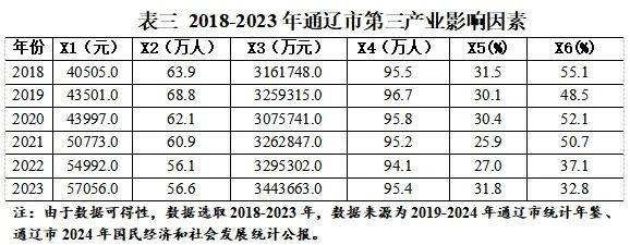 影响第三产业发展的因素十分复杂,包括经济发展水平、资本投入、市场因素等。本文从宏观经济角度选取6个变量,研究其对第三产业的发展。一是总体发展水平。一个城市或地区的经济发展水平提高,往往伴随着人均收入水平的提高,从而增加对服务产品的需求,促进第三产业快速发展。用人均GDP表示总体经济发展水平,记为X1。二是人力资本。劳动力的数量和素质对一个产业的发展具有重要影响,地区第三产业越蓬勃发展,越是需要更多的高质量就业人员。用第三产业从业人数表示人力资本水平,记为X2。三是消费市场规模。消费是生产的动力,扩大消费需求,提高消费贡献率,有助于加快经济结构调整,促进产业结构优化升级,从而为第三产业发展提供巨大动力。用社会消费品零售总额来表示消费市场规模,记为X3。四是城市化水平。城市化使得城镇人口增加,第三产业消费者和从业者也会相应增加,产业结构发生变化,第三产业获得加快发展。用城镇人口数表示城市化水平,记为X4。五是财政支出水平。主要用于体现政府的推动作用,利用财政支出加大产业投入,或是完善公共基础设施,发展社会事业,提高居民生活水平,都将直接或间接地促进第三产业的发展。用财政支出占GDP的比重来表示财政支出水平,记为X5。六是投资力度。固定资产投资包括基本建设、更新改造、房地产开发等方面的资本投入,用于完善设施和技术装备,促进固定资产再生产,对第三产业同样具有推动作用。用第三产业投资占全部固定资产投资的比重表示投资力度,记为X6(详见表三)。