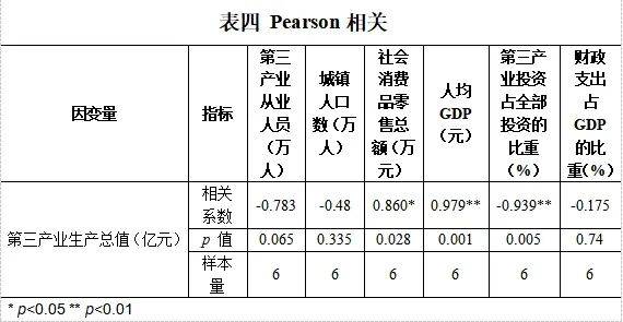运用SPSS软件对人均GDP(X1)、第三产业从业人数(X2)、社会消费品零售总额(X3)、城镇人口数(X4)、财政支出占GDP的比重(X5)、第三产业投资占全部固定资产投资的比重(X6)与全市第三产业生产总值之间相关性进行分析,分析结果见下表四所示。