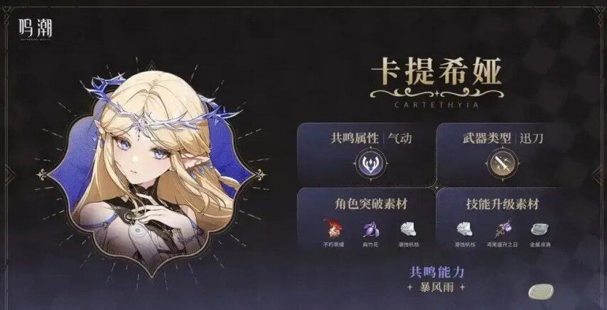 常态下,她使用迅刀进行攻击。普攻通过迅刀快速斩击,第三段攻击触发气刃回旋,可造成范围型的气浪伤害。战斗中还能叠加气动印记,连续命中敌人可使印记叠加,当印记叠满后,她会化身气流,释放多段切割攻击,这一技能不仅具有位移效果,还能带来可观的爆发伤害。进入爆发状态(类似 Excalibur)后,技能将被替换。共鸣解放后,卡提希娅会进入大卡提形态,此时将拥有一套全新的攻击模组。在攻击结束后,会结算范围内目标的风蚀效应并进行引爆,对敌人造成巨额伤害。其大招是跳跃到高空召唤气旋,对敌人产生吸附的控制作用,随后巨剑下劈,制造出空间裂隙,敌人将受到真实伤害,实现持续的群体攻击。