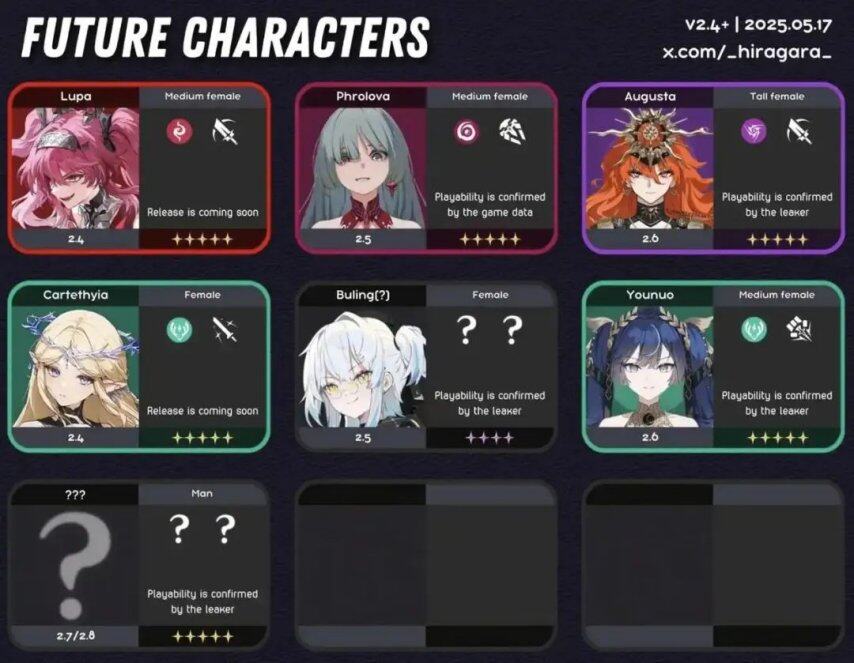 但是有一点玩家还是要知悉:后续的2.5-2.7卡池也会有更多的新角色登场,小道消息:五位新角色,分别是:弗洛洛、卜灵、奥古斯塔、尤诺、以及新五星男角色,对这几位有爱的要留意自己的抽卡资源了~